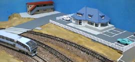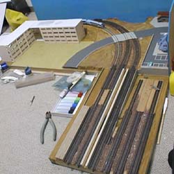 ついに全ボードの石膏作業が終わりました。 これからは建物や道路が中心の作業に移ります。 さっそく、隣のミニボードのホーム作成作業に入りました。 このホームは隣のボードの続きで、当鉄道最高編成の10両編成の収容にあわせて設計してあります。 ちなみに1番線・2番線が11両。3番線が10両の有効長です。